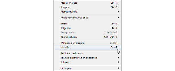 De toetscombinatie Ctrl+H of Ctrl+T stelt u in staat om de opties Willekeurige volgorde of Herhalen in te schakelen.