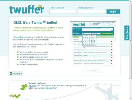 Twuffer biedt de functie om vast vooruit te kunnen twitteren. Op de website van Twuffer (www.twuffer.com) is het mogelijk om tweets in te voeren en een datum plus tijdstip te kiezen om de tweet te laten verschijnen. Er zit zelfs een kalender in de website gebouwd om makkelijk een plaatsingsdatum uit te zoeken. Op de website worden al uw vooruitgeplaatste tweets onthouden, zodat ze op een later moment nog te beheren zijn. Het praktisch nut van Twuffer laat zich aanvankelijk afvragen, maar de praktijkvoorbeelden op de website tonen dat de dienst best toegevoegde waarde biedt. Zo is Twuffer een handige tool voor bijvoorbeeld notificaties, reminders en aankondigingen. Zo kan het Twitter een extra kalenderfunctionaliteit geven, wat erg handig is voor 24-7 twitter-fanatici. Of natuurlijk kunt u ook de schijn ophouden dat u nooit slaapt. Het lijkt erop dat er ook een functie is om tweets in het verleden te plaatsen. Maar helaas, in praktijk blijkt dit trucje niet te werken. Twuffer blijkt dus geen ‘ik heb het je nog gezegd’-dienst.