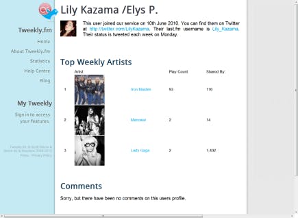 Om Tweekly (www.tweekly.fm) te gebruiken hebt u twee hoofdingrediënten nodig: een Last.fm- en een Twitter-account. De dienst plaatst wekelijks door op Twitter welke artiesten u het meest hebt geluisterd die week. Op de website van Tweekly is het mogelijk om in te loggen met uw twitter-accountgegevens. Vervolgens koppelt u uw Last.fm-gegevens en voilà, Tweekly verzorgt de wekelijkse muzikale update aan uw volgers. Tweekly plaatst niet alleen wekelijks de drie meest geluisterde artiesten, ook wordt er een link geplaatst naar een klein profieltje op Tweekly, waar u niet alleen het overzicht nogmaals voorgeschoteld krijgt, maar dit ook kunt vergelijken met andere Tweekly-gebruikers. De profielpagina heeft ook een reactiefunctie ingebouwd, reacties worden echter ook direct op Twitter doorgeplaatst als direct message. Verschillende instellingen zijn aan te passen op Tweekly.fm: onder andere een koppeling naar Facebook, de plaatsingsdag, wat er precies geplaatst wordt en welke hashtag de tweet meekrijgt. Tweekly.fm doet nog niet zo heel lang dienst, meer aanvullende opties voor deze virtuele tussenpersoon worden nog verwacht.