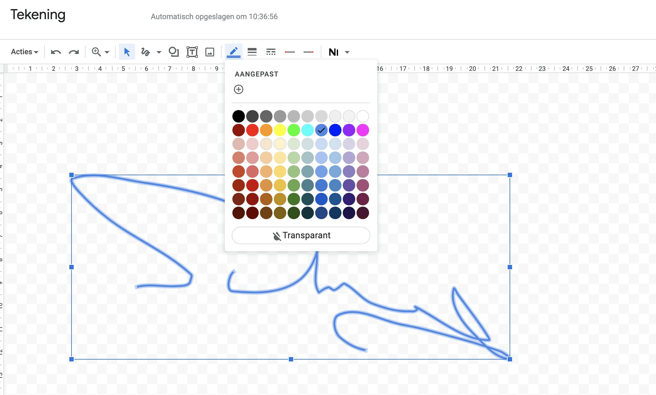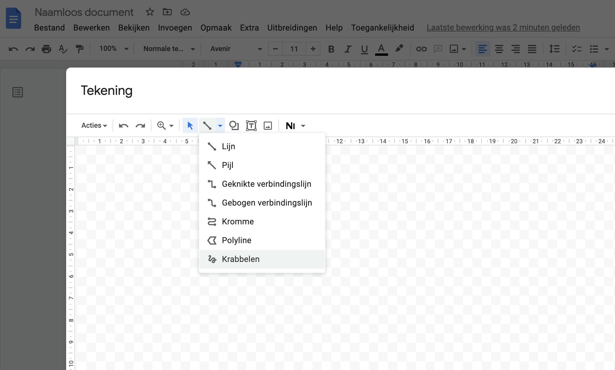 Op de achtergrond van het canvas zie je een blokjespatroon. Dit patroon geeft aan dat de achtergrond transparant is. Handig, want hierdoor kun je je handtekening straks eventueel zelfs gedeeltelijk over de tekst slepen. Klik in de knoppenbalk op het pijltje naast het pictogram met het lijntje en kies voor de opdracht Krabbelen.