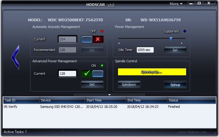 In de afdeling Tools tref je nog een paar extra handigheden aan, waaronder een overzicht van de eigenschappen die je schijf (niet) ondersteunt, behoorlijk geavanceerde controlemechanismen (genre Power Management en Spindle Control), een aantal zelftests (voorzien vanuit de schijfcontroller) evenals een temperatuurmonitor.