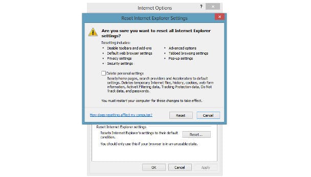 Als je erin geslaagd bent om de desktopversie van je browser onherstelbaar te beschadigen, klik dan op het tandwielicoon aan de rechterkant van de IE-werkbalk, en selecteer Internet Options. Open in het nieuwe venster het tabblad Advanced en klik helemaal onderaan op de knop Reset. Beslis of je persoonlijke instellingen (zoals je thuispagina) ook wilt verwijderen, en klik nogmaals op Reset om je browser volledig te herstellen.
