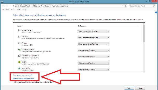 Als je vindt dat je teveel gedempt hebt, klik dan met de rechtermuisknop op een leeg gedeelte van de taakbalk en selecteer Properties. Open het tabblad Taskbar en klik op Customize. Onder de lijst met opties staat de blauwe link waar je naar op zoek bent: Restore default icon behaviors.