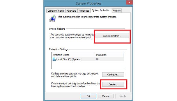 System Restore punten worden automatisch wekelijks aangemaakt, of telkens wanneer je een nieuwe app of update installeert. Om handmatig een snapshot van je systeem te maken - bijvoorbeeld voordat je probeert een cruciale systeemupgrade te installeren - ga naar Control Panel > System and Security > System en selecteer System Protection in het linker paneel. Klik op de knop Create onderaan en je back-up is voltooid.