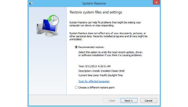 Als je deze functie ooit moet gebruiken, ga naar dezelfde plek en klik op de knop System Restore... waarna een wizard je door de duidelijke functie heen helpt.