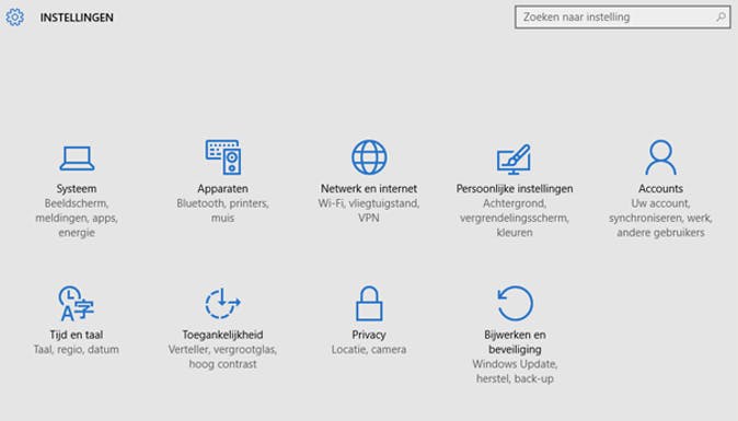 Wanneer je in Windows 10 op de knop Start drukt (waarbij we nog altijd juichen dat die weer terug is) zie je nergens de vermelding Configuratiescherm, maar in plaats daarvan zie je wel een optie Instelling. Wanneer je hierop klikt krijg je een minimalistisch menu te zien, met daarin opties als Systeem, Apparaten, Netwerk en internet, enzovoort. Is dit nu het nieuwe Configuratiescherm? Lees ook: Zo pas je het startmenu van Windows 10 aan.