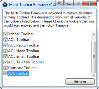 De Multi-Toolbar Remover verwijdert alleen oude versies van de Ask Toobar.