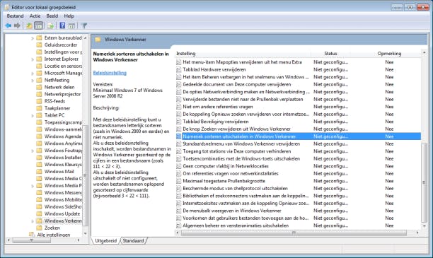 Ons antwoord: Nadat we uw situatie hebben nagebootst, zijn we erachter wat de oorzaak van dit probleem is. Inderdaad gebruiken beide programma's een andere methode om de bestandsnamen te sorteren. De Windows Verkenner in Windows 7 sorteert bestanden numeriek. Zo komt nummer 2 in de sortering boven nummer 11 te staan. Excel gebruikt voor cellen met cijfers en letters een alfabetische sortering. Om de volgorde in beide programma's gelijk te trekken kunt u de sortering van de verkenner aanpassen. Typ hiervoor gpedit.msc in het zoekvenster van het startmenu druk op Enter. Ga naar Gebruikersconfiguratie / Beheersjablonen / Windows-onderdelen / Windows Verkenner. Zoek hier Numeriek sorteren uitschakelen in Windows Verkenner en dubbelklik erop. Selecteer Ingeschakeld en klik op OK. Nu zal uw verkenner de bestanden voortaan niet meer numeriek sorteren. Via dezelfde weg kunt u de instelling ongedaan maken.