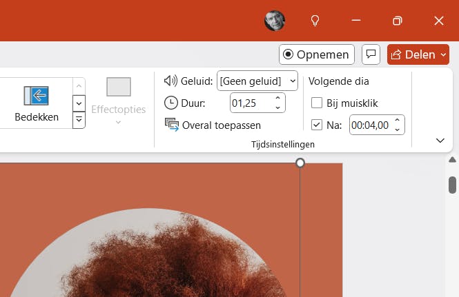 Zo’n oneindige lus in PowerPoint werkt zowel in de Windows-versie als op de Mac. Momenteel heeft PowerPoint op het web geen lus-functie. Voordat je de presentatie instelt op herhalen, moet je eerst de timing goed controleren. Je kunt immers dezelfde tijd voor iedere dia instellen of bepaalde dia’s langer in beeld houden. Open de presentatie en ga naar het tabblad Overgangen. In het onderdeel Timing zorg je dat er geen vinkje staat in het vakje Bij muisklik. Je vinkt het vakje Na aan en je stelt het aantal seconden in dat de dia te zien is. Je kunt ook de pijlknopjes gebruiken om in kleine stapjes de tijdsduur te verhogen of te verlagen. Als je dezelfde timing voor alle dia’s wilt gebruiken, dan selecteer je hier de optie Overal toepassen. Wil je per dia andere tijden instellen, dan moet je de volgende dia selecteren en voer je ook daar in het Na-vakje de specifieke tijden in. Herhaal dit voor de resterende dia’s.