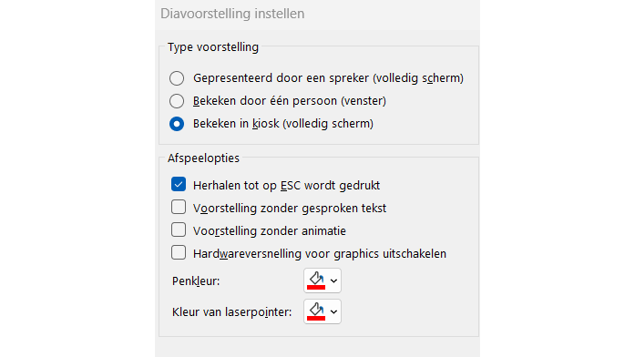 Zodra is ingesteld hoelang de dia’s in beeld blijven, kun je de instelling Herhalen inschakelen. Ga naar het tabblad Diavoorstelling en selecteer Diavoorstelling instellen in het gedeelte Instellen. In het pop-upvenster kies je een type voor de voorstelling. Ben je van plan de voorstelling te presenteren of door één persoon te laten bekijken, dan kies je een van de eerste twee opties. Wil je dat de diavoorstelling automatisch wordt afgespeeld dan kies je de derde optie: Bekeken in kiosk (volledig scherm).