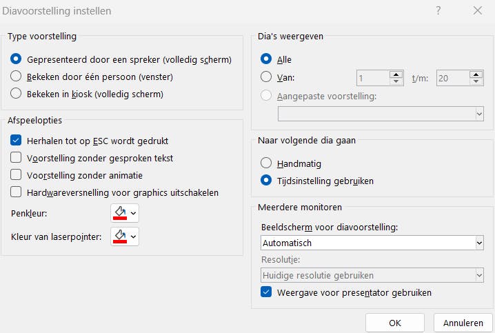 In het onderdeel Afspeelopties vind je de functie die je nodig hebt: Herhalen tot er op Esc wordt gedrukt. Daarna ga je naar het vak Naar volgende dia gaan. Hier duid je aan dat PowerPoint tijdens de herhalingen de tijdinstelling moet aanhouden met de optie: Tijdinstelling gebruiken. Eventueel kun je hier nog andere opties aanpassen, zoals welke dia’s er in een lus moeten draaien. Gebruik de OK-knop om de instellingen op te slaan.