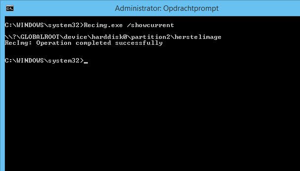 Als je een computer met Windows 8.1 voorgeïnstalleerd hebt gekocht, zou er al een herstelimage aanwezig moeten zijn. Heb je de pc zelf geüpgraded naar Windows 8.1, bijvoorbeeld omdat Windows 8 erop stond, dan heb je nog geen goed herstelimage en dien je dit aan te maken. Het is in beide situaties aan te raden om je herstelimage te controleren. Gebruik Windows-toets+X en start Opdrachtprompt (administrator). Geef de opdracht recimg.exe /showcurrent. Als er geen herstelimage aanwezig is, krijg je de melding: There is no active custom recovery image. Als je systeem wel een herstelimage heeft gevonden, zie je het pad hiervan en krijg je de melding: Operation completed successfully.
