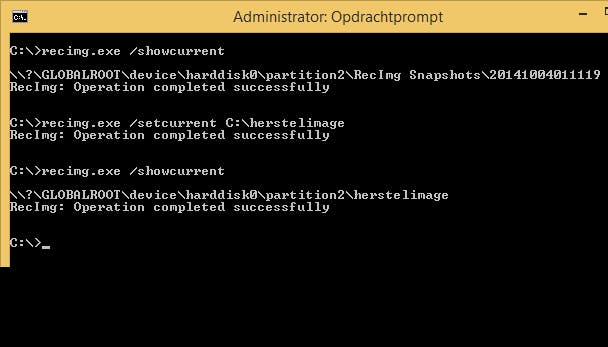 Standaard wordt het meest recente herstelmoment geactiveerd. Je kunt eenvoudig schakelen tussen je imagebestanden door een andere map actief te maken. Gebruik de toetscombinatie Windows-toets+X en start Opdrachtprompt (administrator). Geef de opdracht recimg.exe /showcurrent om te zien welk herstelpunt Windows nu heeft geactiveerd. Geef de opdracht recimg.exe /setcurrent c:\herstelnov14 om dit herstelmoment te activeren. Controleer je actieve herstelmoment met de opdracht recimg.exe /showcurrent.