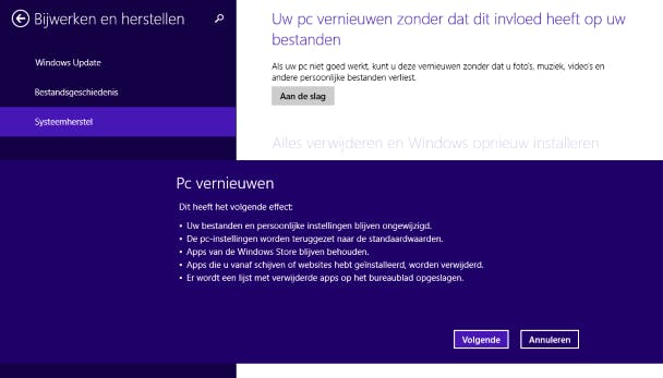 Je herstelt je Windows 8.1-systeem het eenvoudigst als Windows nog in staat is om normaal op te starten. Open de Charms-balk en kies Instellingen / Pc-instellingen wijzigen / Bijwerken en herstellen / Systeemherstel. Klik bij Uw pc vernieuwen op Aan de slag. Er wordt een wizard gestart waarin je uitleg vindt over de gevolgen van je actie. Vervolgens wordt de herstelprocedure uitgevoerd. Je persoonlijke bestanden en programma-instellingen blijven behouden. De herstelprocedure neemt veel tijd in beslag, waarna je je computer weer kunt gebruiken vanaf het moment van je meest recente imagebestand.