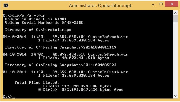De herstelimagebestanden nemen veel schijfruimte in beslag. Als je niet weet hoeveel images er op je computer staan en waar deze staan opgeslagen, kun je ze op een eenvoudige manier opsporen. De bestanden hebben de extensie .wim. Je kunt alle wim-bestanden snel vinden vanaf de opdrachtprompt. Gebruik de toetscombinatie Windows-toets+X en start Opdrachtprompt (administrator). Als je je C-schijf wilt onderzoeken, open je deze schijf met de opdracht c:. Geef nu de opdracht cd\ en laat al je mappen onderzoeken met de opdracht dir /s /a *.wim. Met dir vraag je de inhoud op van een map en /s zorgt ervoor dat ook alle submappen worden doorzocht. Met /a worden speciale mappen doorzocht, bijvoorbeeld met het kenmerk 'systeem' en het kenmerk 'verborgen'. Bij deze opdracht is *.wim het zoekcriterium om alle bestanden te vinden die eindigen op .wim.