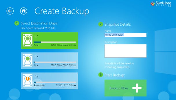 Download en installeer RecImg Manager. Zodra je het programma hebt gestart, krijg je twee opties: Backup en Restore. Met de knop Backup kun je een imagebestand aanmaken voor Windows 8.1. RecImg Manager bewaart het imagebestand automatisch in een submap van C:\RecImg Snapshots. Geef altijd een goede omschrijving mee, zodat je later weet op welk moment je de back-up hebt gemaakt.