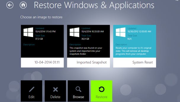 Met Restore kun je een imagebestand terugzetten. RecImg Manager maakt eveneens wim-bestanden aan, dus je kunt voor de herstelprocedure ook de standaardopties van Windows 8.1 (Pc vernieuwen) gebruiken.