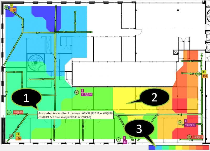Helaas bieden lang niet alle merken de mogelijkheid om de uitzendsterkte te beperken, terwijl dat bij het gebruik van meerdere accesspoints wel een heel belangrijke optie is. Denk er trouwens aan dat je de uitzendsterkte voor de 2,4- en 5GHz-band individueel zult moeten tweaken. De 2,4GHz-band heeft immers een heel ander bereik dan de 5GHz-band. Om tot een goede plaatsing en zendsterkte te komen, kun je gebruikmaken van een heatmap.