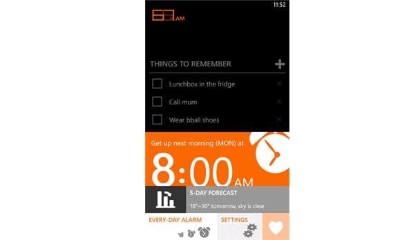627.AM is een app voor Windows Phone die verschillende handige functies voor de ochtend combineert. Zo doet de app prima dienst als wekker, maar er zijn ook een digitaal notitieblok en uitgebreide weersverwachting in de app verwerkt. Zo hoef je nu nog maar naar een scherm te kijken om erachter te komen waneer je uit bed moet, wat je aan kan trekken en of je nog iets speciaals moet doen. Zelf vind ik dit een erg slim antwoord op de app-routine die veel mensen 's morgen hanteren. Het enige dat ik dan nog mis is een ingebouwde reader voor het laatste nieuws.