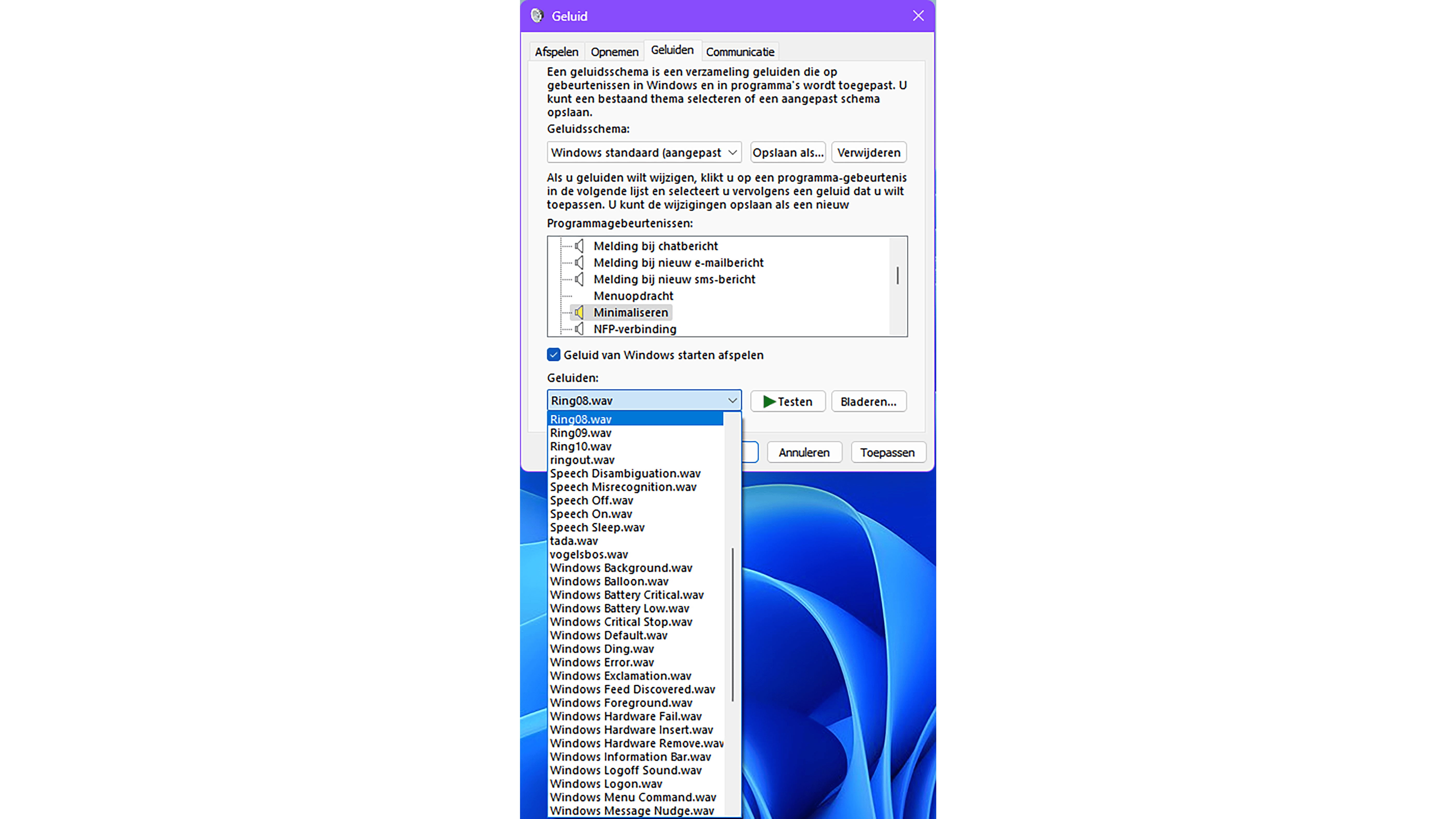 Op het tabblad Geluiden van het dialoogvenster Geluid staat waarschijnlijk de optie Windows standaard ingesteld en dat mag je voorlopig zo laten.