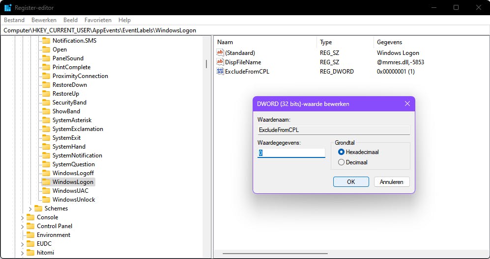 Druk op de Windows-toets+R en voer Regedit uit. Navigeer naar de sleutel Computer\HKEY_CURRENT_USER\AppEvents\EventLabels\WindowsLogoff. Selecteer deze sleutel en dubbelklik in het rechterdeelvenster op ExcludeFromCPL. Wijzig de waarde van 1 naar 0 en bevestig met OK. Herhaal dezelfde stappen voor de sleutel WindowsLogon, die je vlak daaronder vindt. Sluit vervolgens de Register-editor af.