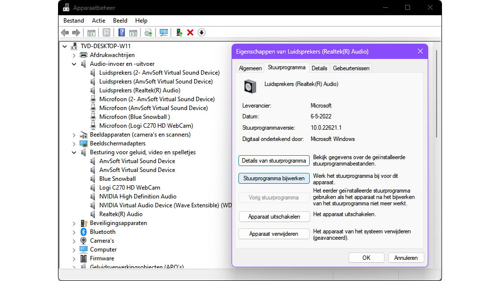Als de stappen in de vorige tip niet werken, controleer dan de audiodrivers. Druk op Windows-toets+X en kies Apparaatbeheer. Open de sectie Besturing voor geluid, video en spelletjes en klik met de rechtermuisknop op het stuurprogramma van je audioapparaat. Als er onlangs een driverupdate is uitgevoerd, kun je terugkeren naar de vorige versie die wel werkte. Ga hiervoor naar Eigenschappen, open het tabblad Stuurprogramma en klik op Vorig stuurprogramma. Probeer ook een driverupdate; klik op Stuurprogramma bijwerken en kies eerst Automatisch zoeken naar stuurprogramma’s. Als dit niet werkt en je hebt een geschikte driver gevonden op de website van de producent, kies dan voor Op mijn computer naar stuurprogramma’s zoeken en volg de instructies. Als laatste redmiddel kun je het apparaat verwijderen, in de hoop dat Windows na een herstart automatisch een goed functionerende driver installeert.