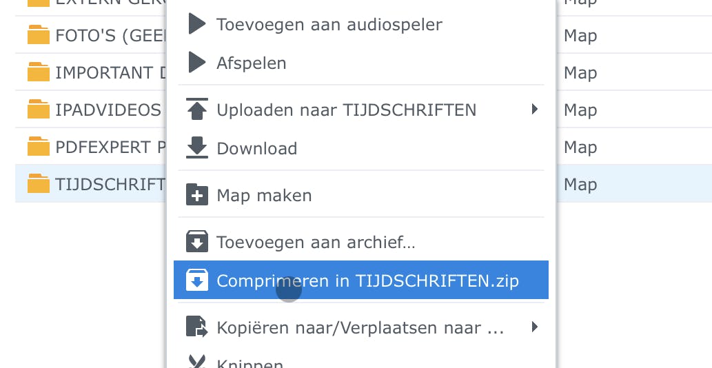 Nu de praktijk. Log in bij de bron-NAS via de webinterface (het kan ook mobiel via de app, voor de liefhebbers) en start File Station (de bestandsbeheerder van je Synology NAS). Blader naar de map die je wilt kopiëren of verplaatsen en klik daar met de rechter muisknop op. Klik in het geopende contextmenu op Comprimeren in <mapnaam>.zip.