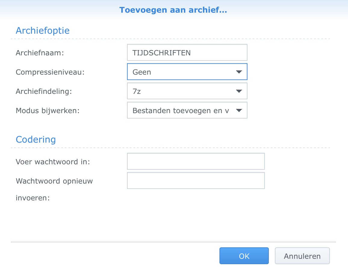 In het venster dat daarop opent, kies je achter Archiefindeling voor 7z. Kies dan achter Compressieniveau voor Geen. De bestandsnaam mag je wat ons betreft laten voor wat ie is (let wel op dat hier ook geen ‘gekke’ tekens inzitten, natuurlijk!). Klik op OK en het ‘7zippen’ begint. Dat kan een proces zijn van een paar minuten of als je pech hebt een paar dagen of zelfs meer. Geen drama echter: je kunt gewoon uitloggen bij je Synology; het proces gaat ook dan rustig door. Zorg echter wel dat je geen nieuwe bestanden plaatst in de onder behandeling zijnde map, of exemplaren verwijdert. Zijn er bestanden die in de betreffende map thuis zouden horen, zet ze dan in een tijdelijke map en hevel ze achteraf over.