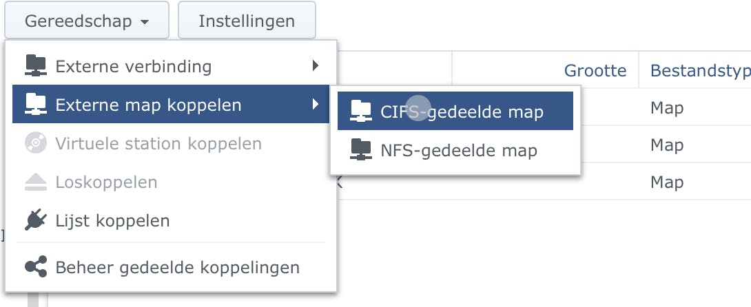 Is het 7zip-proces klaar, dan resulteert een (mogelijk gigantisch) .7z-bestand. Om dat over te hevelen naar een andere NAS, log je in bij de doel-NAS. Start File Station en blader naar een gedeelde map daarop. Maak hierin de map aan met (bijvoorbeeld) de naam Extern gekoppelde mappen. Ga deze binnen middels een dubbelklik. Klik op de knop Gereedschap, dan op Externe map koppelen en tot slot op CIFS-gedeelde map.