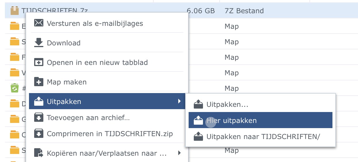 Is het .7z-bestand eenmaal overgeheveld, dan rest alleen nog uitpakken. Dat doe je door er met de rechter muisknop op te klikken en dan de optie Hier uitpakken te kiezen (of een van de andere opties als je meer controle over de doelmap wilt). Dan wordt het weer even wachten en klaar. Je kunt het .7z-bestand nu verwijderen, net als de bronmap op de originele NAS als je van plan was deze te verplaatsen en niet te kopiëren.