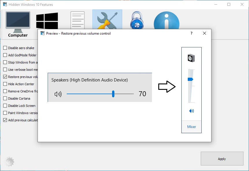 In het onderdeel Systeem kun je bijvoorbeeld Aero Shake uitschakelen, uitgebreide opstartberichten activeren, het oude verticale volumeschuifje herstellen, OneDrive verwijderen uit Verkenner, Cortana uitschakelen, de Windows-versie op het bureaublad weergeven, het kleine rekenmachine terughalen enzovoort. Normaal moet je om een map in God-modus op het bureaublad te plaatsen geheimtaal typen: GodMode.{ED7BA470-8E54-465E-825C-99712043E01C}. Nu is dat een slechts een kwestie van één vakje aanvinken. In het onderdeel Veiligheid kun je dan weer de optie Autorun aan- of uitzetten. In de meeste gevallen moet je wel herstarten om de geselecteerde aanpassing te activeren.