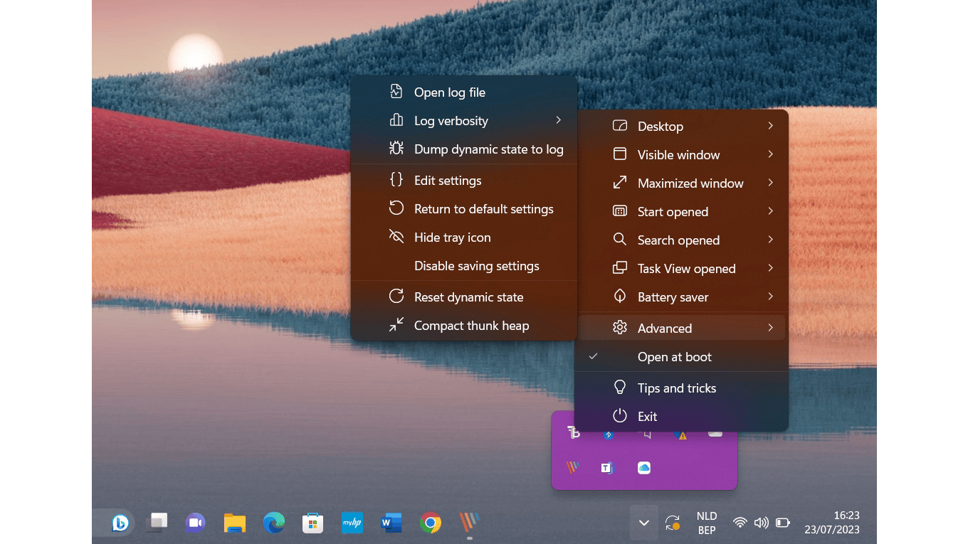 Door met rechts op het pictogram van deze tool te klikken, open je de instellingen. Als je daarin zou verdwalen kun je altijd nog via Advanced / Return to default settings naar de standaardinstelling terugkeren. Belangrijk is de optie Open at boot om de tool samen met het systeem te laten opstarten. In de optie Desktop zal de taakbalk doorzichtig worden bij de instelling Clear. Kies je Normal, Opaque of Acrylic, dan komt de taakbalkachtergrond weer tevoorschijn. Opaque geeft een donkere achtergrond en Acrylic een lichtere achtergrond. Het is ook mogelijk om te bepalen hoe de taakbalk zich in verschillende situaties moet gedragen. Zo kun je bijvoorbeeld instellen dat hij standaard transparant blijft, maar dat hij wanneer je Start of het Zoekvak aanspreekt een kleurtje krijgt.