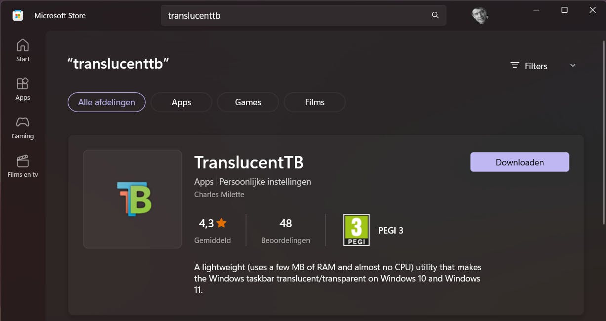 De transparantie komt het best tot zijn recht bij een donker thema. Om de taakbalk iets transparanter te maken, kun je al gebruikmaken van de personalisatie-instellingen van Windows, maar ‘met iets transparanter’ nemen we geen genoegen. Daarom doen we een beroep op de third-party-oplossing TranslucentTB. Ook binnen te halen via de Microsoft Store. Het gaat om software die heel weinig RAM gebruikt. Het heeft dus geen enkele invloed op de prestaties van je computer.