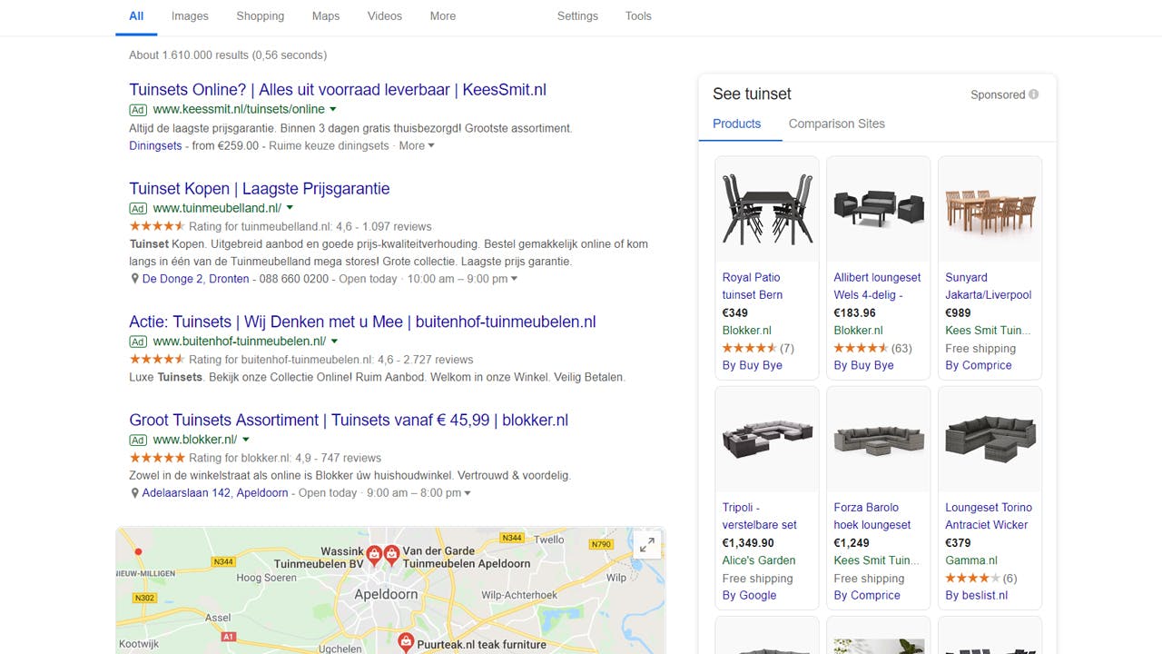 Stel, je bent op zoek naar een tuinset. Na ‘tuinset kopen’ in te hebben getikt, krijg je bij de resultaten eerst de privacyherinnering van Google te zien, maar daarna begint het circus al. De eerste zoekresultaten onder die privacyherinnering zijn betaald, daar staat ook duidelijk met groen vermeld dat het gaat om een ‘Advertentie’. Daaronder zie je Google Maps met daarbij drie websites die tuinsets verkopen, dan pas de echte zoekresultaten met daarnaast nog een heel ‘Nu Winkelen’-gedeelte waar in het lichtgrijs ‘Gesponsord’ bij wordt vermeld.