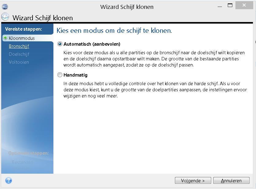 We starten Acronis en kiezen voor Schijf klonen. De wizard vraagt vervolgens welke modus we willen. Standaard staat deze op Automatisch. In dit geval is dat perfect, want de bronschijf is kleiner dan de doelschijf. We klikken weer door.