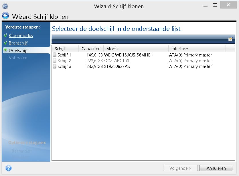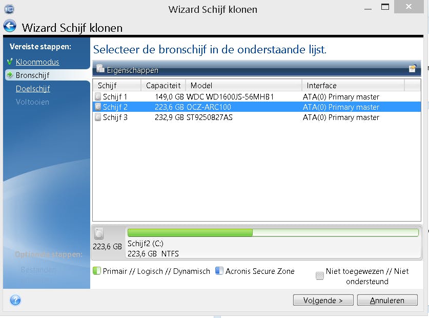 We moeten hier de bronschijf kiezen. Hij staat op de OCZ, maar we kiezen uiteindelijk de WDC: de startschijf. Controleer dit altijd goed!