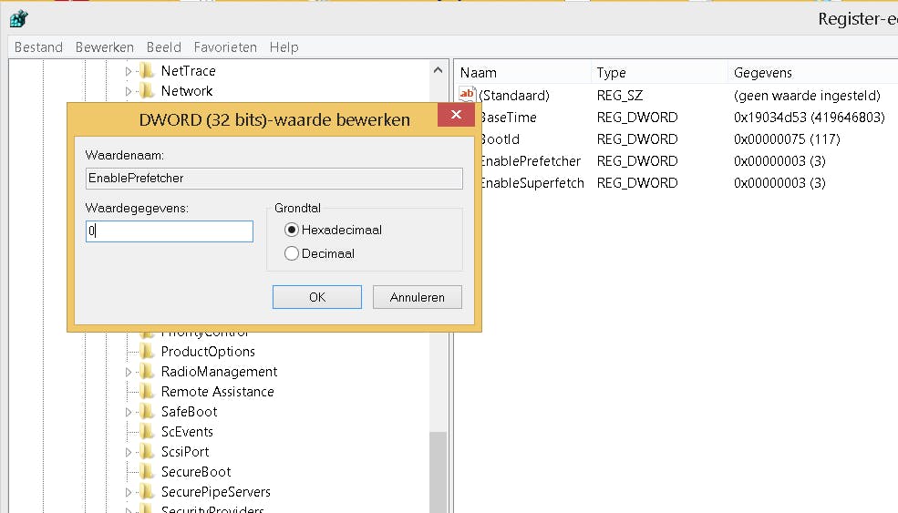 U vindt daar in geval van Windows 8 twee items: prefetch en superfetch. Als u dubbelklikt op een item, kunt u de DWORD-waarde aanpassen. Zet deze op 0 om het uit te schakelen.