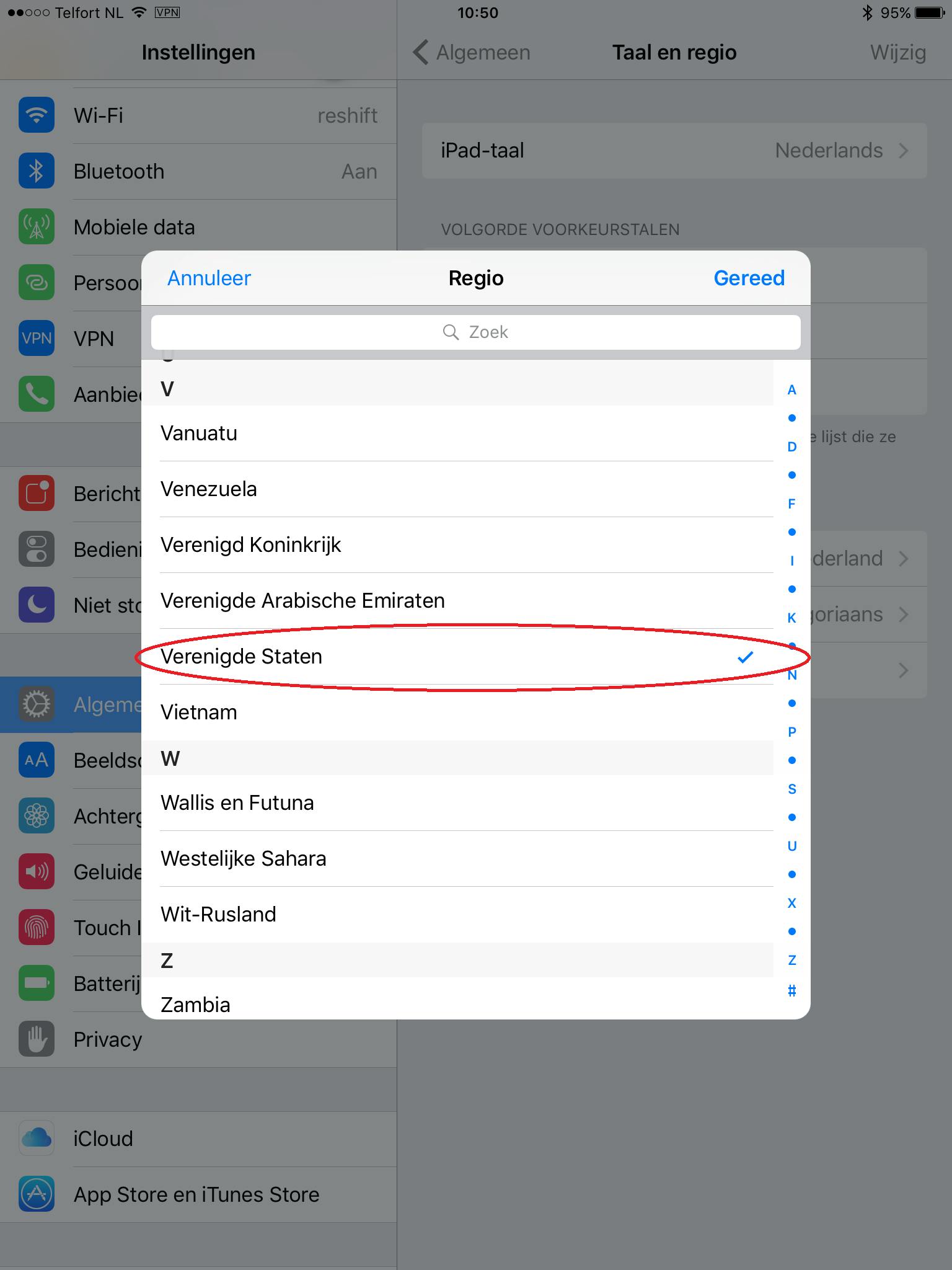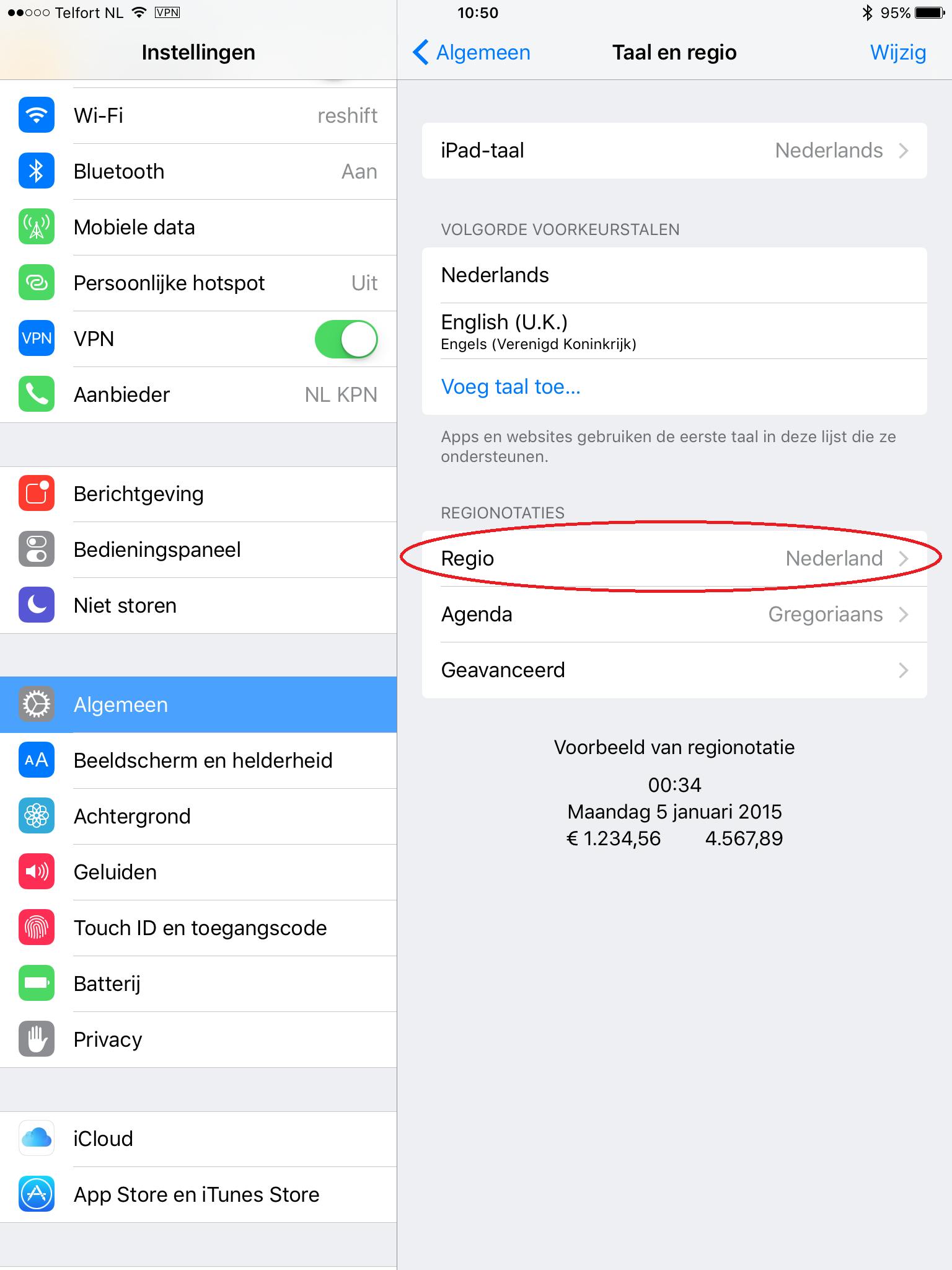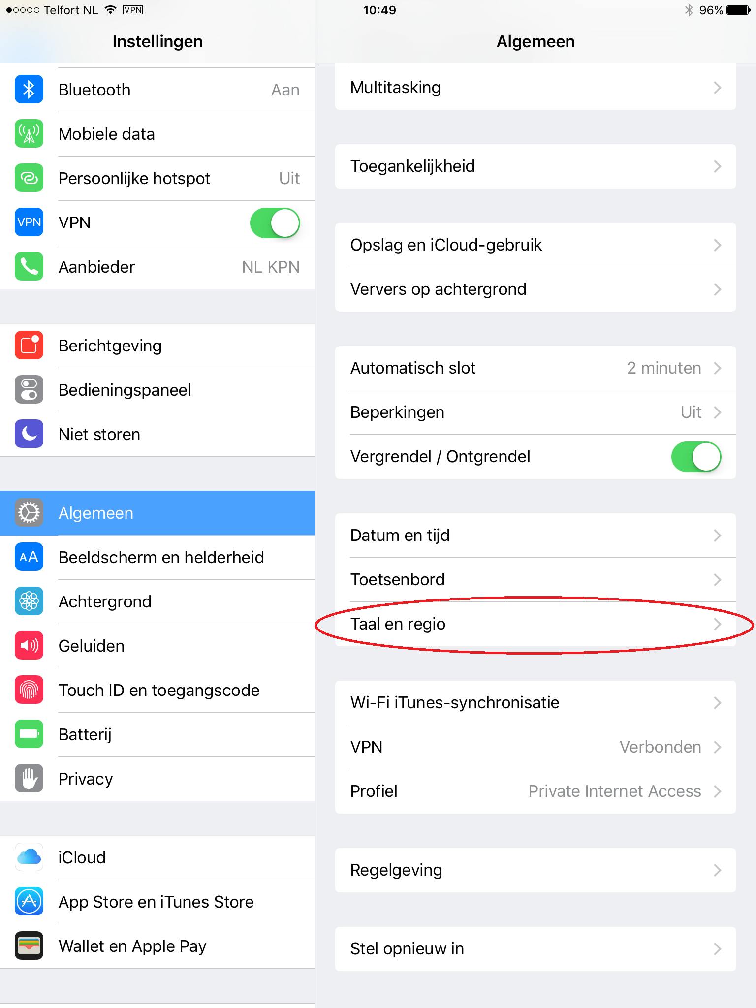 Klik hier onder het kopje 'Regionotaties' op 'Regio', waar in jouw geval waarschijnlijk 'Nederland' staat (dat heb je zo ingesteld bij het instellen van je iPad).