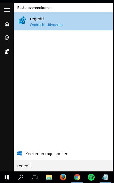 Open het startmenu en typ regedit. Druk op Enter en kies voor 'Ja' bij de popup om het register te openen.