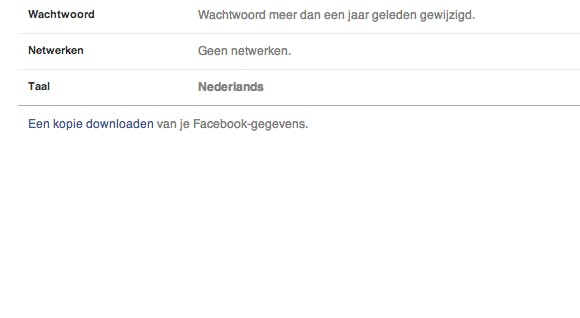 2. Als je op Instellingen hebt geklikt verschijnt er een nieuw venster waarin je links een kolom ziet met een aantal opties en rechts een groot vak met daarin jouw gegevens. Onderaan staat de optie Kopie downloaden van je Facebookgegevens.