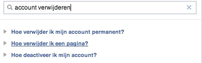 2. Type in het invoervak bovenaan hoe verwijder ik mijn account, dan krijg je een aantal opties te zien (Facebook howto’s) en kies dan Hoe verwijder ik mijn account permanent?