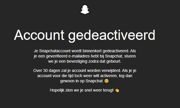 Je krijgt nu een bevestiging te zien van het feit dat je account gedeactiveerd is. Je krijgt een mail waarin bevestigd wordt dat je account gedeactiveerd is. Deze deactivatie is voor 30 dagen. Je accountgegevens en groepen en dergelijke blijven nog wel actief. Wanneer je na de 30 dagen weer inlogt op Snapchat kun je jouw account weer gebruiken zoals die was. Al je groepen en vrienden heb je nog in je lijst staan.