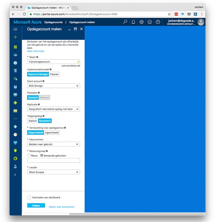 Terug naar het managementportal. Als je links in het menu kijkt, zie je veel bekende termen, zoals virtual machines, web-apps, sql-databases en meer. Speciale aandacht is echter vereist voor de resourcegroepen. Een resourcegroep in Azure is een verzameling van diensten, die je als een eenheid kunt beheren. Je kunt bijvoorbeeld een resourcegroep aanmaken voor je web-app. Die groep bevat dan de web-app zelf, maar ook de sql-database voor de web-app. Je kunt per resourcegroep bijvoorbeeld de locatie kiezen waar deze opgeslagen moet worden en aan welk abonnement je deze wilt koppelen.