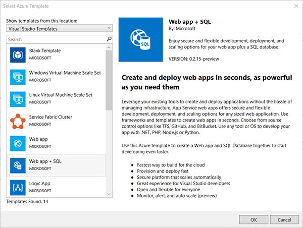 Vul de gevraagde gegevens in en klik op OK. Je kunt nu kiezen uit een reeks standaard Azure-templates van Microsoft. Kies bijvoorbeeld voor Web app + SQL, om snel een web-app in Azure uit te rollen. Klik dan op OK. Visual Studio maakt nu drie bestanden aan: een PowerShell-bestand met de extensie .ps, de template met .json en de parameters voor de template met de extensie .parameters.json.