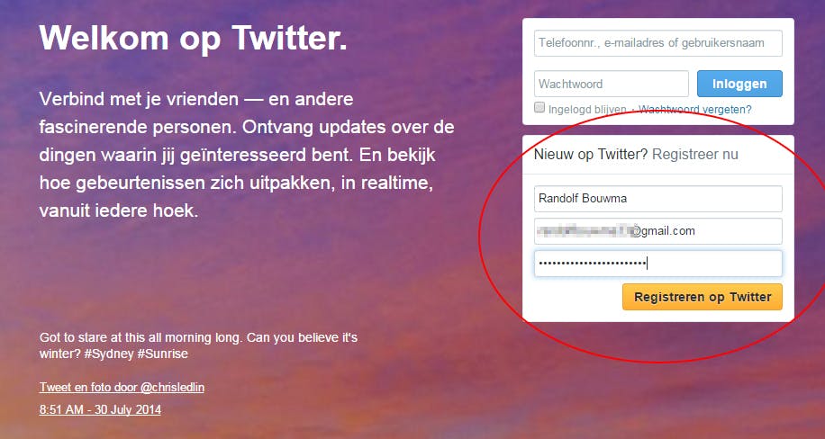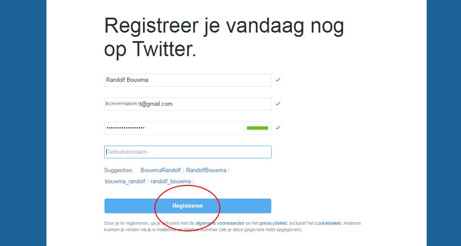 Om Twitter te gebruiken, heb je eerst een account nodig. Registeren doe je op de homepage van Twitter, maar dat kan ook in de apps. Vul je volledige naam en e-mailadres in en kies in het laatste vak een wachtwoord. Klik dan op ’Registreren op Twitter’.
