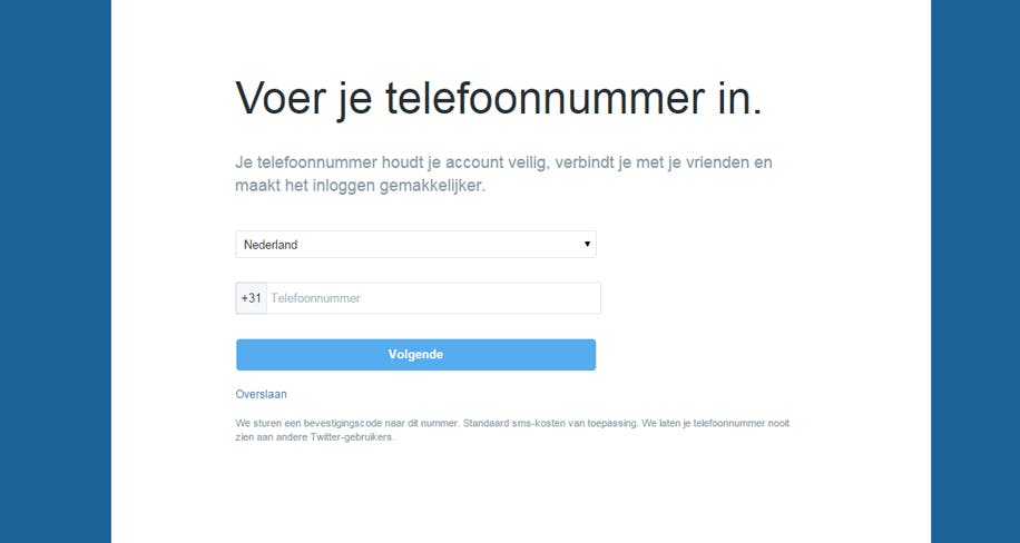 Daarna vraagt Twitter je om je telefoonnummer voor tweestapsverificatie. Dat is een manier om je account beter te beveiligen door je telefoonnummer bovenop je wachtwoord te gebruiken. Dit kun je overslaan, maar tweestapsverificatie is wel een manier om je account beter te beveiligen. Weeg dus goed af of je dit wilt - wij raden aan het in te stellen!