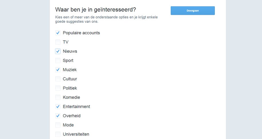 Druk in het volgende scherm op 'Laten we beginnen!’ Nu vraagt Twitter je in welke onderwerpen je geïnteresseerd bent, waarna je suggesties krijgt voor te volgen Twitter-accounts. In het daaropvolgende scherm kun je die accounts aanvinken. Wil je nog niet direct iemand volgen of zit er niets voor je tussen, haal dan het vinkje weg achter 'Alles selecteren’. Hoe dan ook, om verder te gaan druk je rechtsboven op de grote blauwe knop.