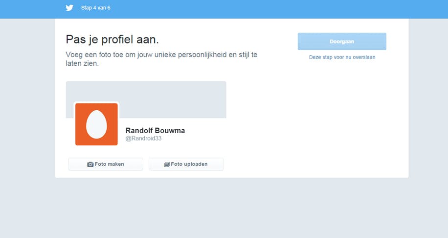 Je komt uit op een pagina die je een profielfoto laat instellen. Bij de optie 'Foto maken’ kan dat via je webcam. Je kunt ook een bestaande foto instellen. Kies dan voor 'Foto uploaden’.