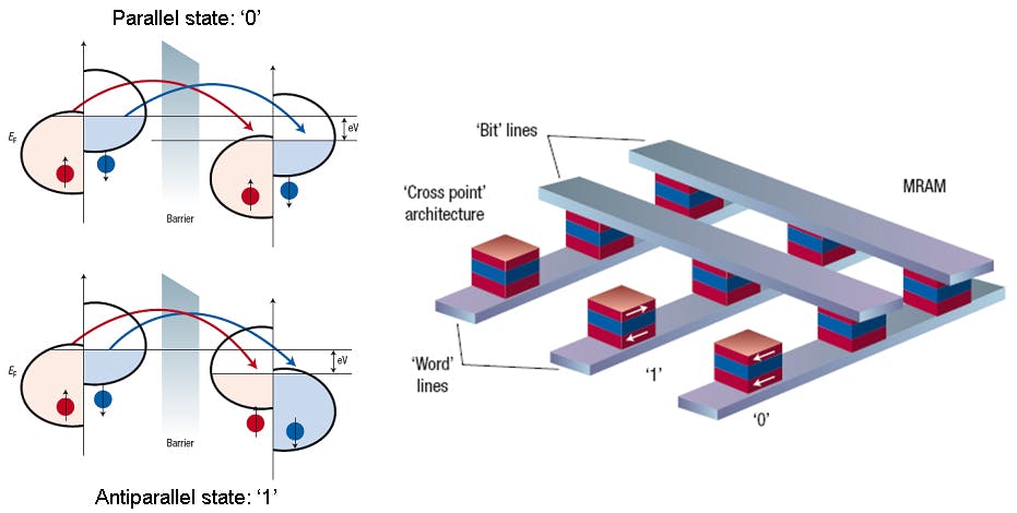 De magnetische laag kan een noordpool of zuidpool zijn. Als beide lagen gelijk zijn (parallel) staat dit voor een 0. Als beiden verschillend zijn (anti-parallel) dan is dit gelijk aan een 1. Als een geheugencel parallel is dan is de weerstand lager dan bij een anti-parallelle cel. Door de weerstand te ‘lezen’ kan er dus bepaald worden of de cel een 0 of een 1 is.