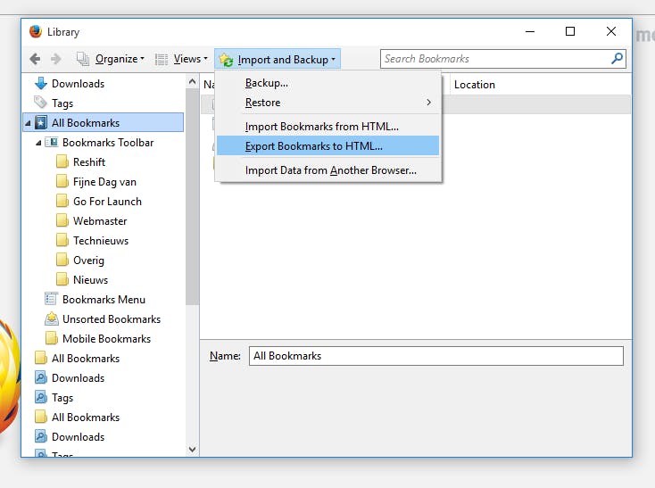 Je krijgt nu een apart scherm te zien met al je bladwijzers. Bovenin staat een nieuw menu, genaamd 'Import and backup'. Klik daarop, en kies voor 'Exporeer bladwijzers naar html'. Je moet nu een html-bestandje met de bladwijzers ergens opslaan. Kies voor een plek waar je ze makkelijk terug kunt vinden, bijvoorbeeld 'Mijn Documenten' of het bureaublad.